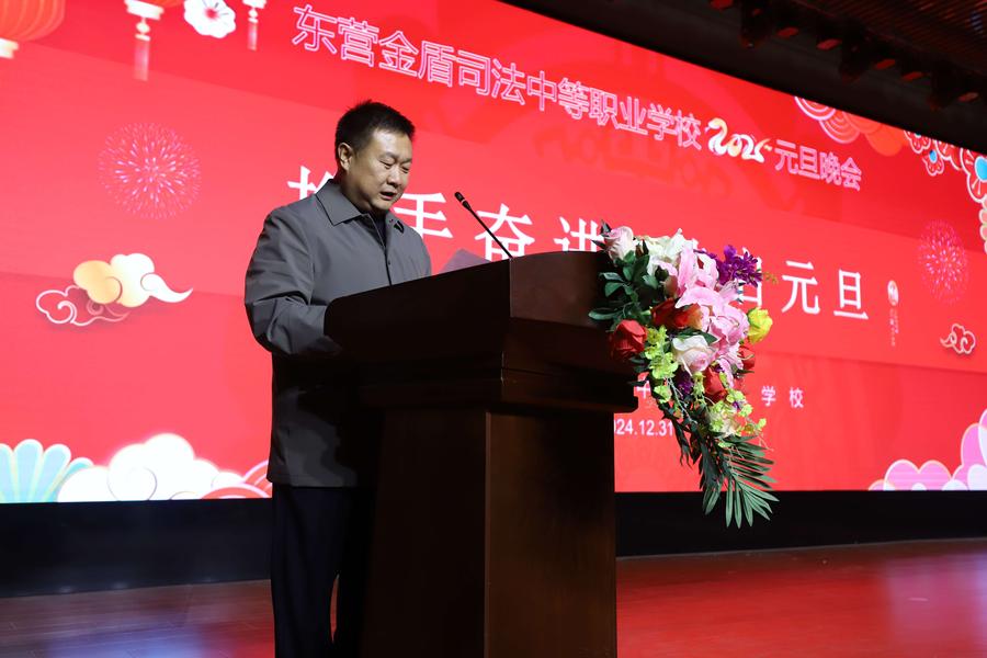 晚会在一段气势磅礴、富有青春活力的开场舞中拉开序幕。随着柔美的音乐和炫丽的舞台灯光,舞者们用精彩的表现点燃了全场观众的热情,预示着一个充满希望和奋进的全新一年即将到来。 晚会开篇,东营金盾司法中等职业学校党总支书记、校长杨万里发表了热情洋溢的致辞,他首先向全体师生、国际友人及各界嘉宾表达了诚挚的问候和新年祝福。他指出,过去的一年,在全体师生的共同努力下,学校在教学、管理和文化建设等方面取得了显著成就,展现了东营金盾司法中等职业学校的独特风采。 杨校长强调,学校将继续致力于培养更多优秀的司法人才,推动学生全面发展,培养学生的社会责任感与使命感。他勉励同学们在新的一年里,要不断进取、勇于创新,敢于承担责任,为实现自己的梦想、为建设更加美好的社会贡献力量。